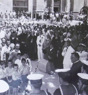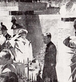 Sulla spianata delle Giummare, gli ufficiali e le autorità assistono alla messa celebrata nella grotta di Lourdes da padre François du Plessis, figlio del comandante Jean du Plessis de Grenédan: il sindaco di Sciacca, l’ammiraglio Jozan, il prefetto di Agrigento, l’ammiraglio Ghé comandante delle Forze Navali Italiane in Sicilia, il signor Spitalier, Console di Francia a Palermo e del tenente di vascello Xavier de La Droitière, figlio di Serge Goislard de la Droitière, passeggero imbarcato volontario sul Dixmude per perfezionamento. Poi arriva il momento commovente in cui i figli di due dispersi del Dixmude, scoprono il busto in marmo del Comandante del Dixmude, realizzato dallo scultore palermitano Alfredo Garufi. I picchetti armati presentano le armi e la musica francese suona gli inni nazionali di Francia e Italia.